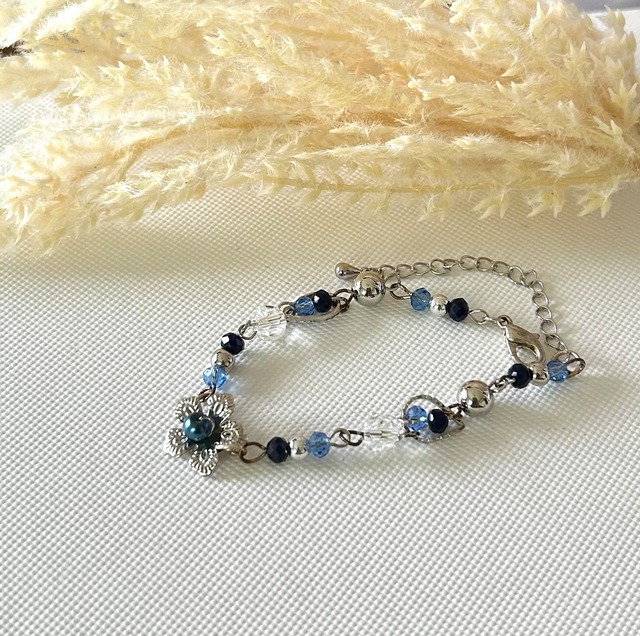 ご覧くださりありがとうございます。 ♪☆3500円以上のお買い求めで送料無料♪☆ ♪*~♪*〜♪*〜♪*〜♪*〜♪*〜♪*〜 メタルビーズのお花を真ん中に飾り、シルバーとブルーなどでカッコよく仕上げたブレスレットです♪ 素材:ビーズ サイズ:長さ約16㎝(アジャスター除く) ♪*~♪*〜♪*〜♪*〜♪*〜♪*〜♪*〜 耳飾りはぶら下がりタイプでしたら、ピアスとイヤリングの交換が出来ますのでお知らせください。 ラッピングご希望の方はお知らせ下さい。 お時間を頂けましたらオーダー作品もお作りできます。 例えば、選べる色に希望の色がない、結婚式のアクセサリー、発表会のアクセサリーみつからないなど、是非ご相談ください♪