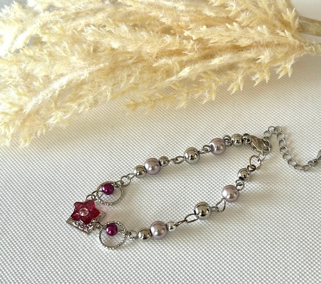 ご覧くださりありがとうございます。 ♪☆3500円以上のお買い求めで送料無料♪☆ ♪*~♪*〜♪*〜♪*〜♪*〜♪*〜♪*〜 白いお花モチーフが2つ。 チェーンとビーズで繋げたブレスレットです♪ 素材:ビーズなど サイズ:長さ約17㎝(アジャスター除く) ♪*~♪*〜♪*〜♪*〜♪*〜♪*〜♪*〜 耳飾りはぶら下がりタイプでしたら、ピアスとイヤリングの交換が出来ますのでお知らせください。 ラッピングご希望の方はお知らせ下さい。 お時間を頂けましたらオーダー作品もお作りできます。 例えば、選べる色に希望の色がない、結婚式のアクセサリー、発表会のアクセサリーみつからないなど、是非ご相談ください♪