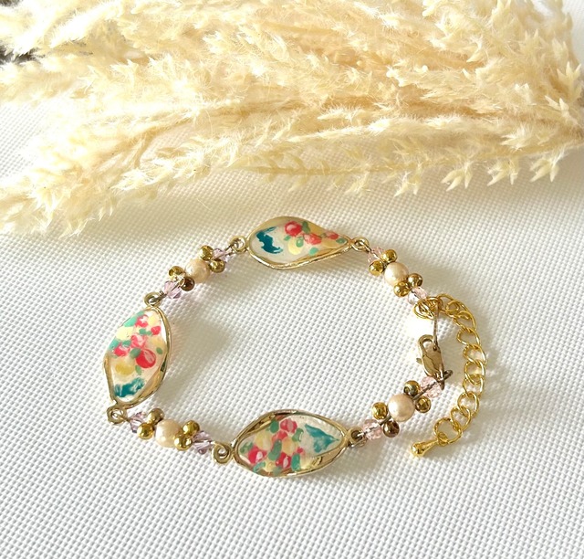 ご覧くださりありがとうございます。 ♪☆3500円以上のお買い求めで送料無料♪☆ ♪*~♪*〜♪*〜♪*〜♪*〜♪*〜♪*〜 お花が描かれたパーツをパールとスワロフスキーのビーズで繋げたブレスレットです♪ 素材:ビーズ サイズ:長さ約17㎝(アジャスター除く) ♪*~♪*〜♪*〜♪*〜♪*〜♪*〜♪*〜 耳飾りはぶら下がりタイプでしたら、ピアスとイヤリングの交換が出来ますのでお知らせください。 また、アレルギー対応は樹脂、チタンで対応可能です。 ラッピングご希望の方はお知らせ下さい。 お時間を頂けましたらオーダー作品もお作りできます。 例えば、選べる色に希望の色がない、結婚式のアクセサリー、発表会のアクセサリーみつからないなど、是非ご相談ください♪