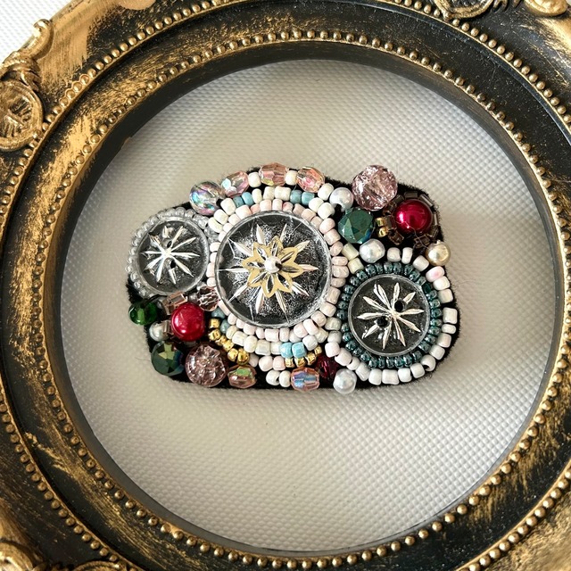 ♪☆3500円以上のお買い求めで送料無料♪☆ ♪*~♪*〜♪*〜♪*〜♪*〜♪*〜♪*〜 3つ並んだサークルが星の様に見えて⭐︎ パレッタです。 パールや沢山のビーズを飾ったアンティークなデザインです。 素材::ビーズなど サイズ:5㎝x3.5㎝