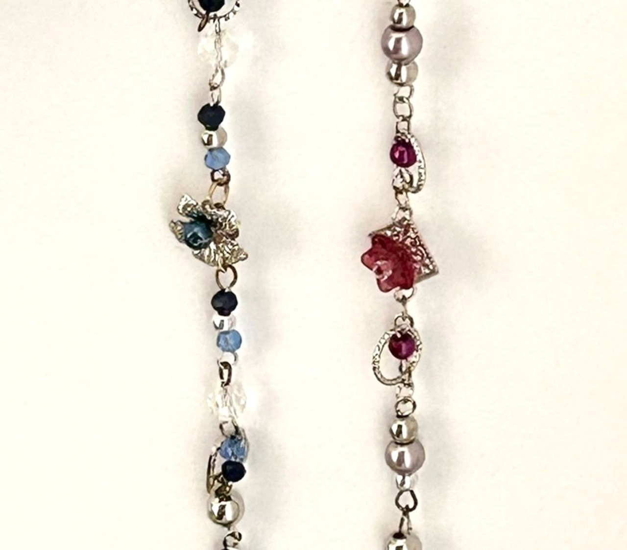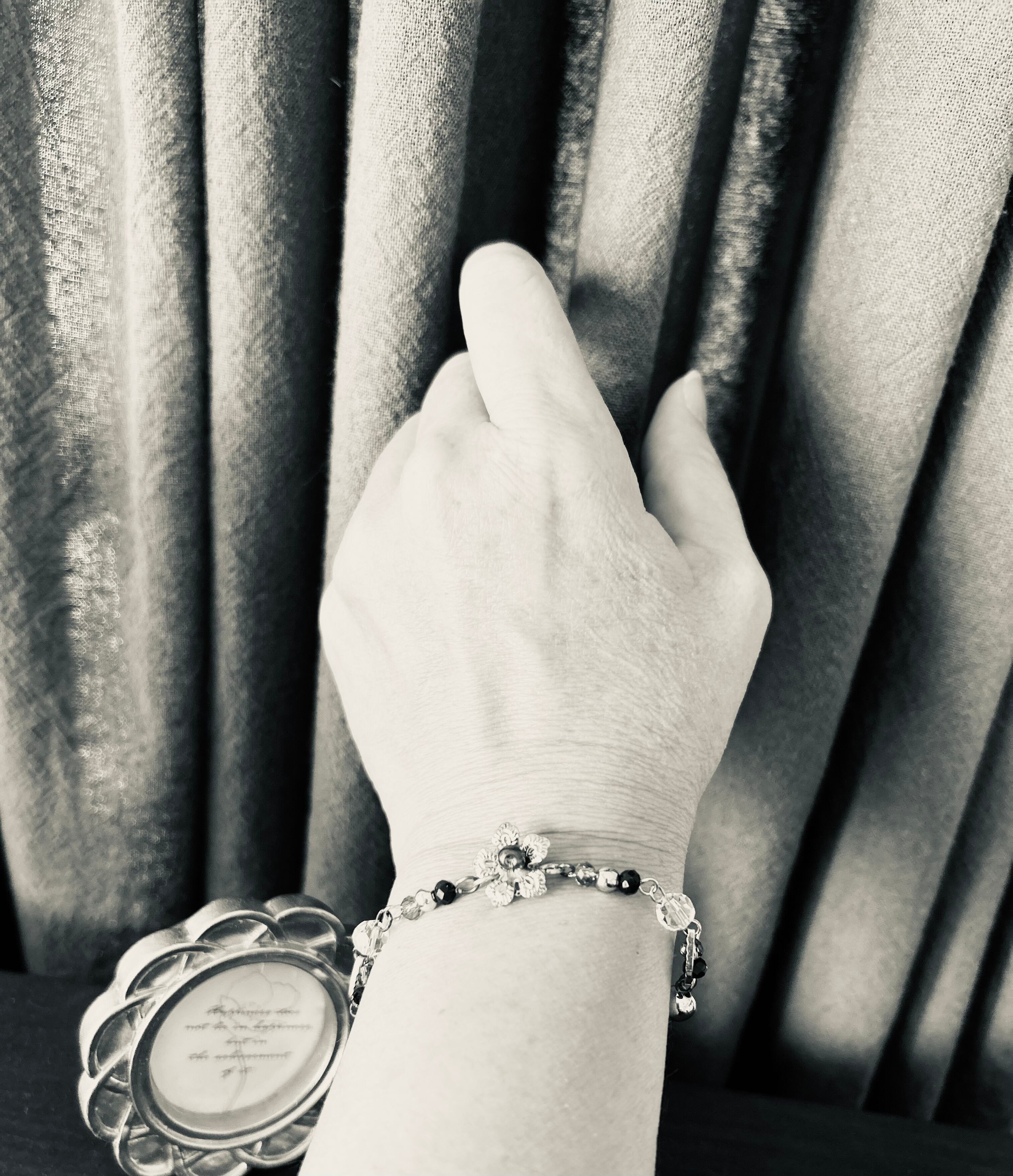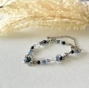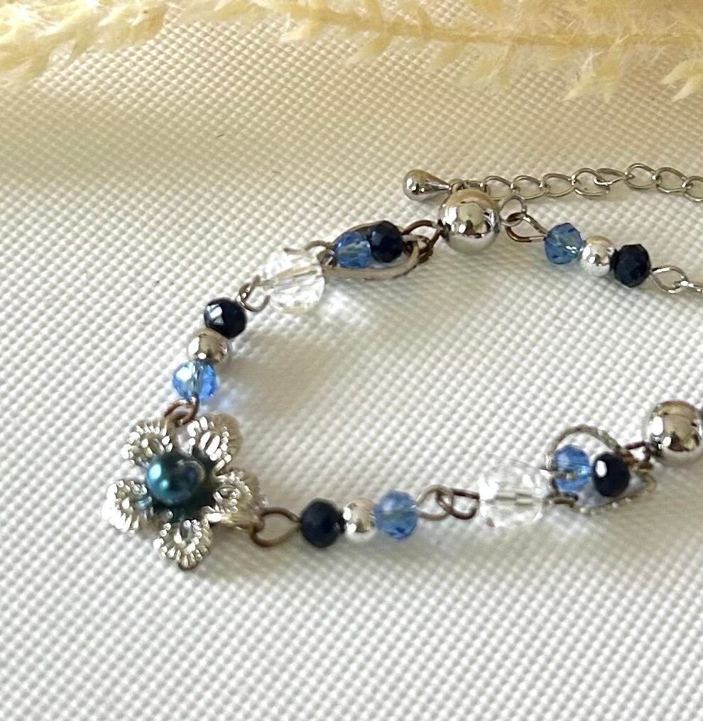 メタルビーズのお花を真ん中に飾り、シルバーとブルーなどでカッコよく仕上げたブレスレットです♪
