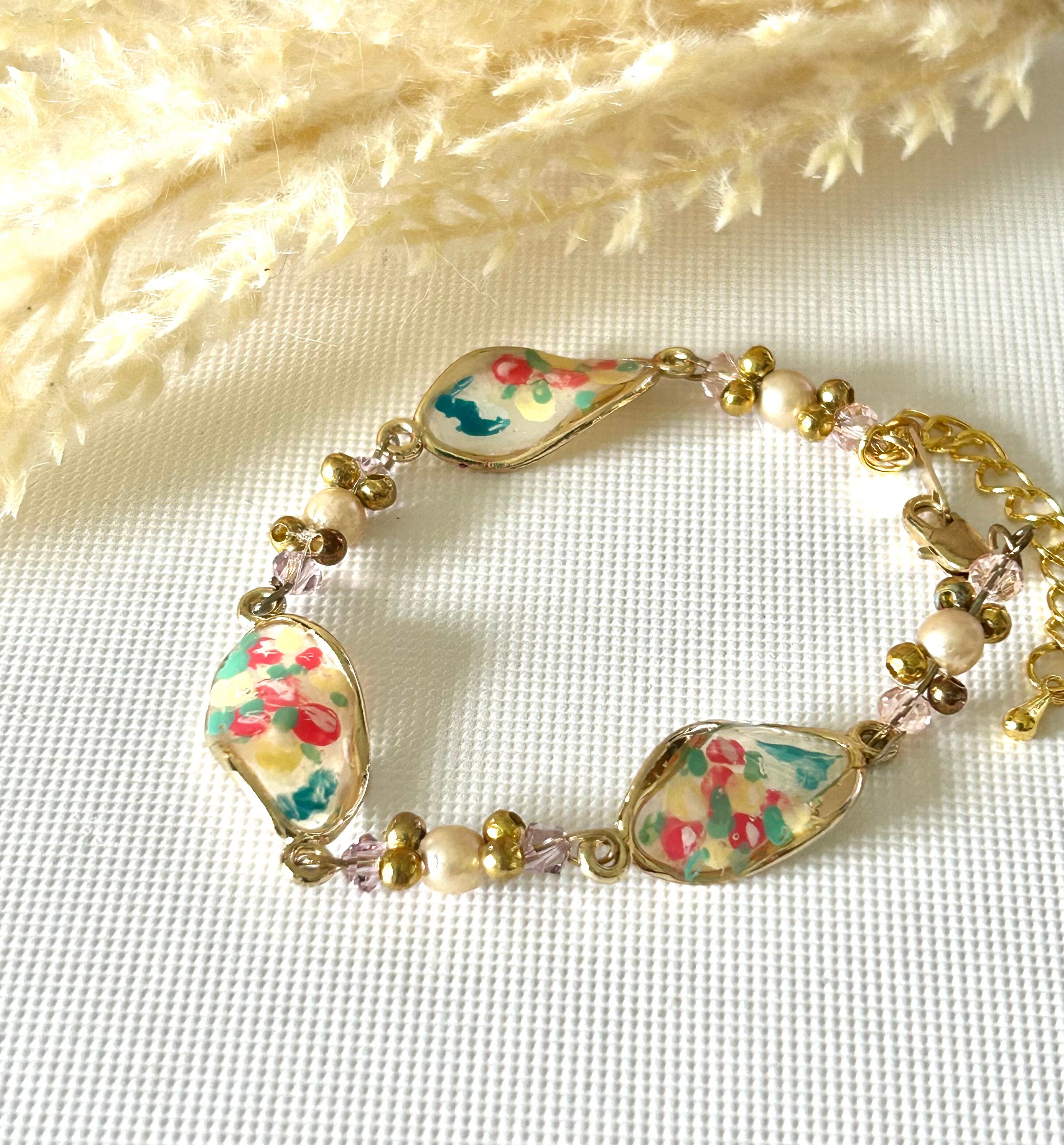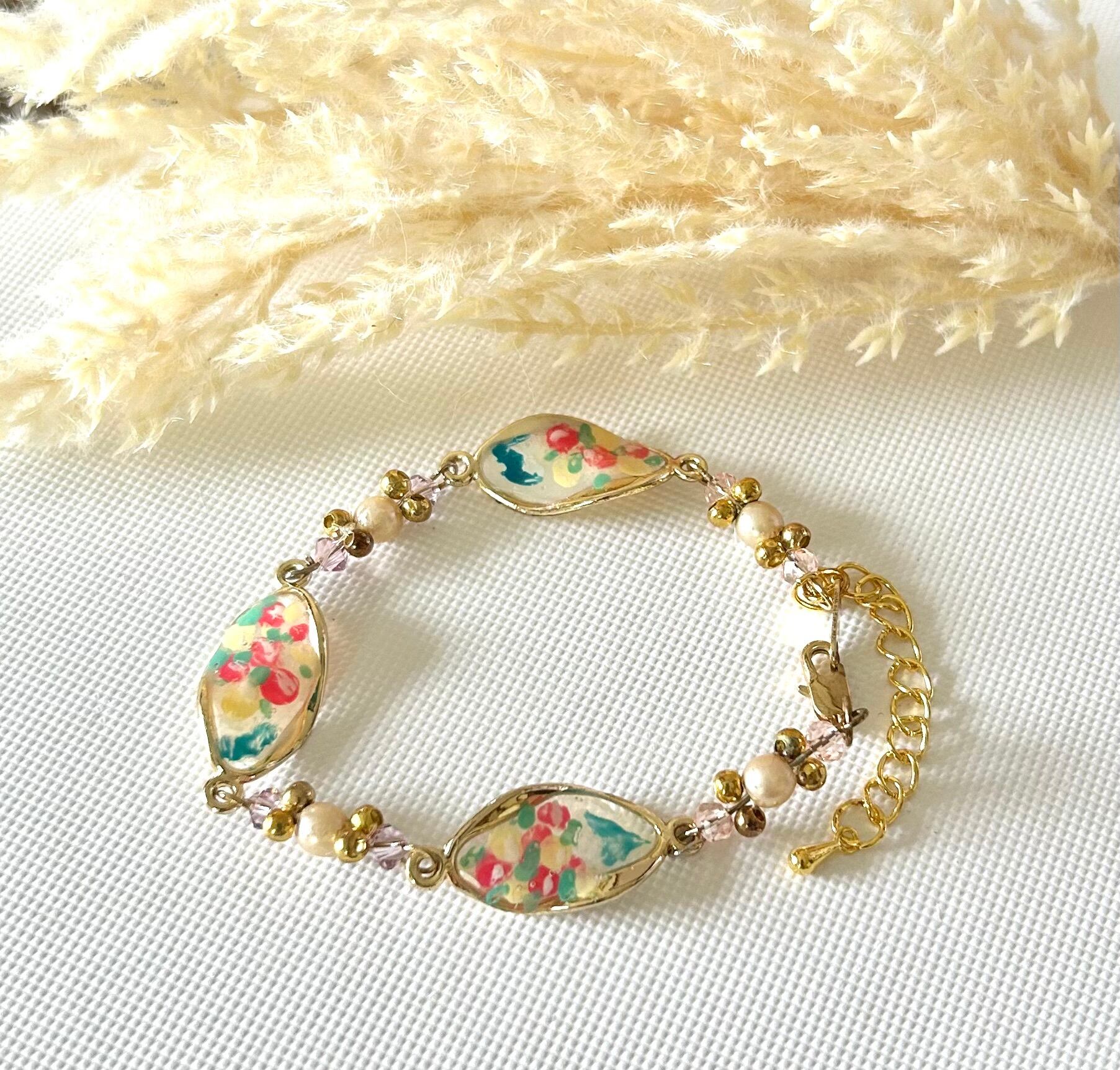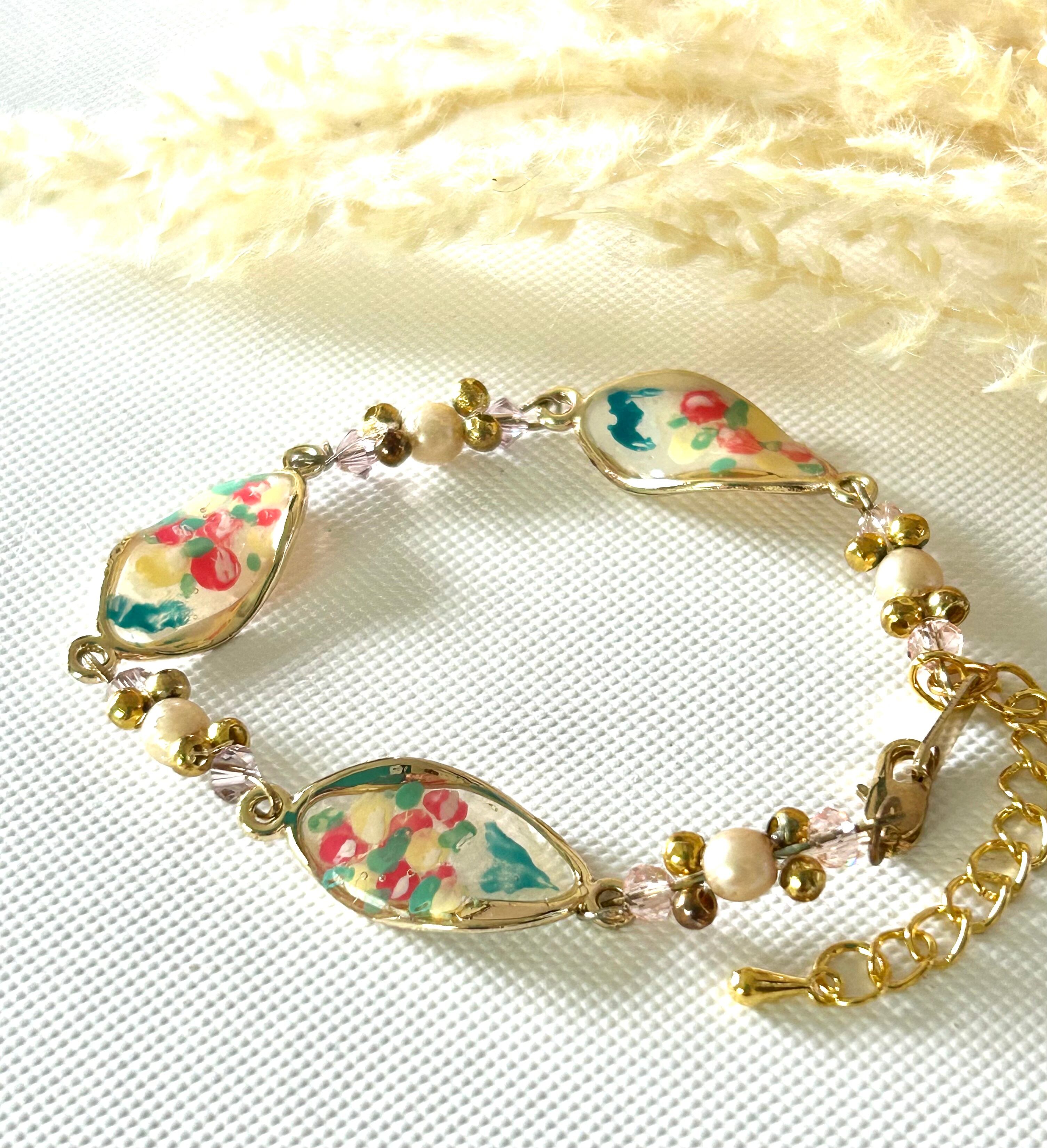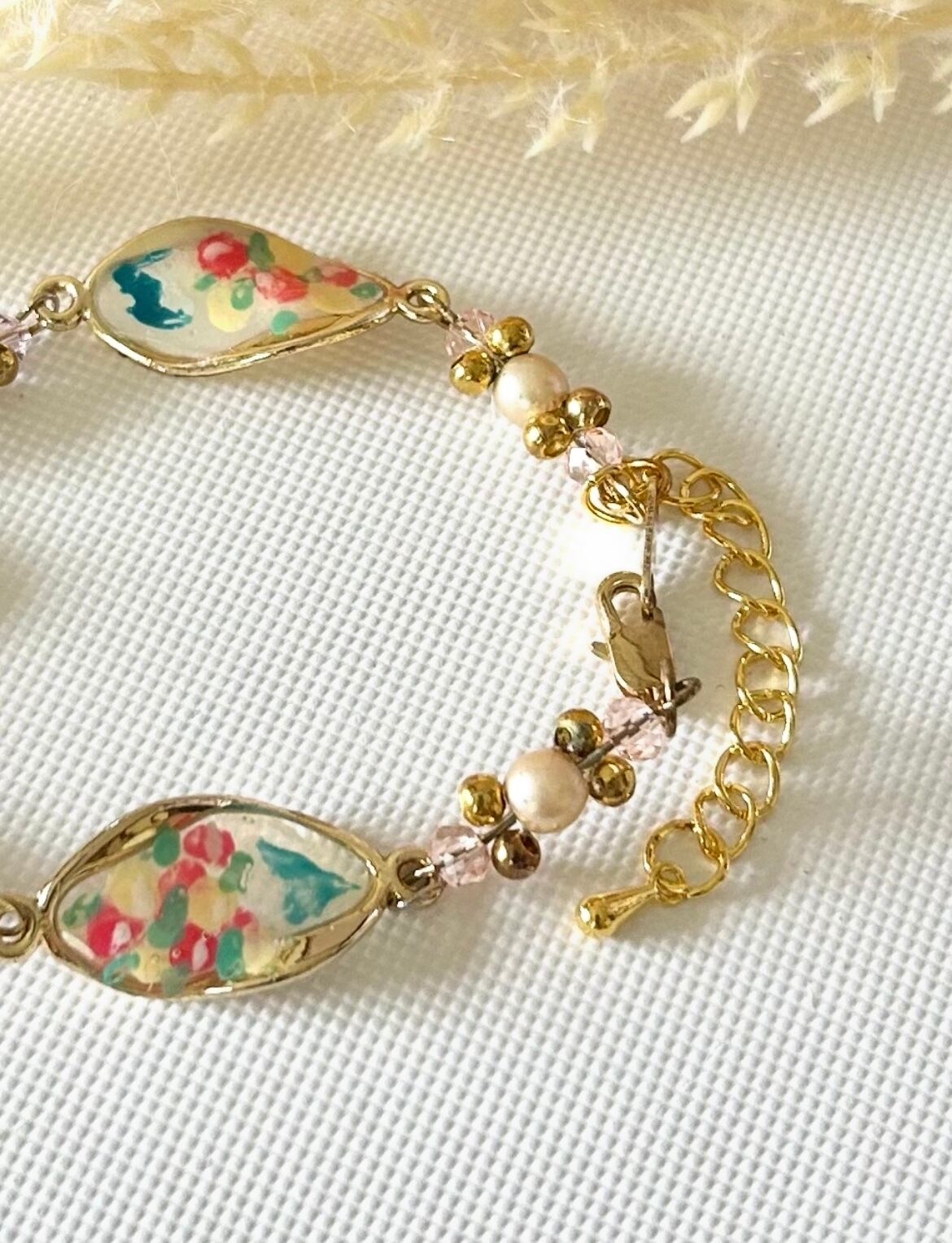 お花が描かれたパーツをパールとスワロフスキーのビーズで繋げたブレスレットです♪