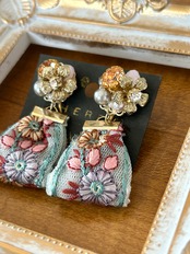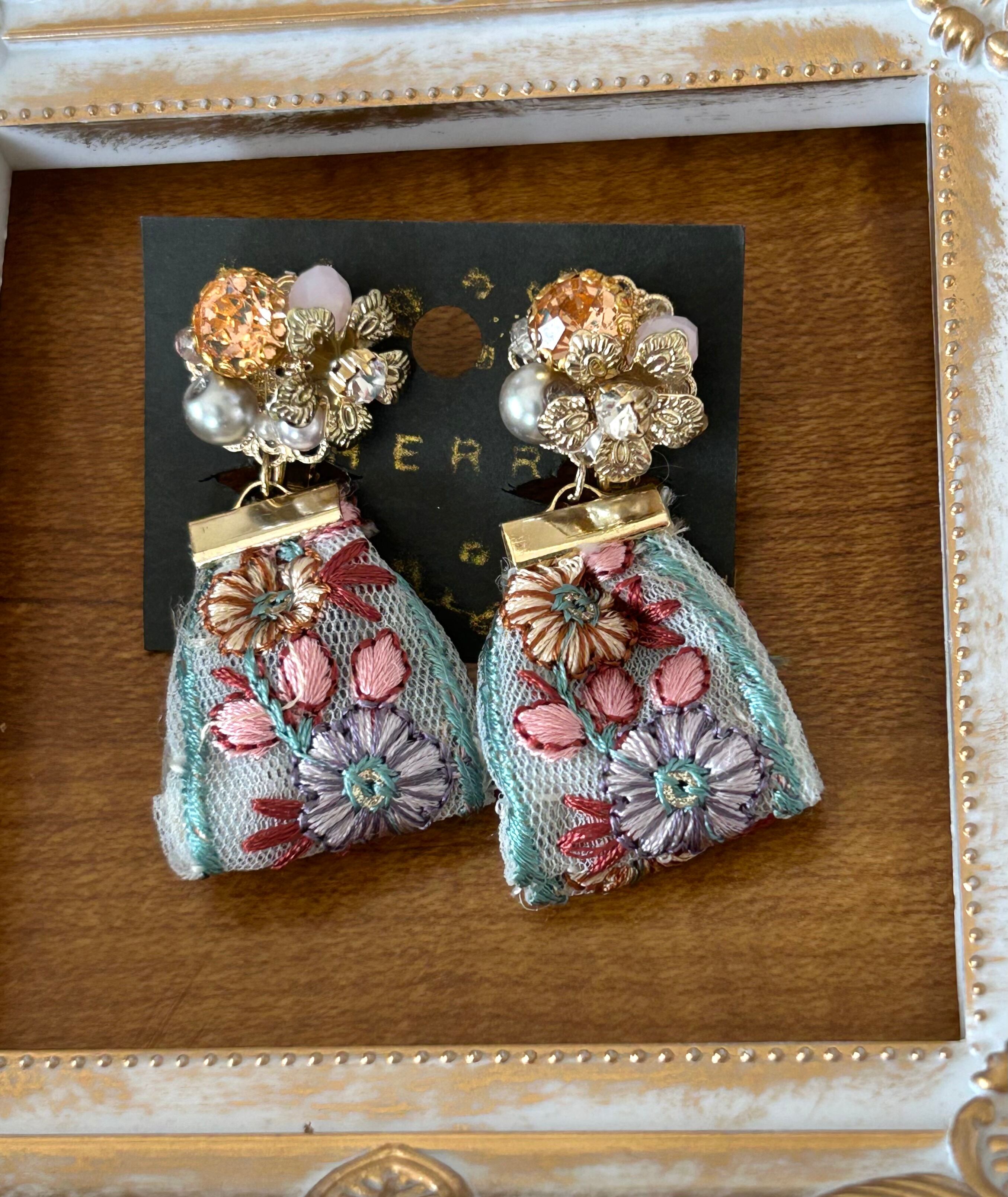 水色のインド刺繍りぼんと花モチーフ、ビーズを合わせたアンティークな雰囲気のイヤリングです。