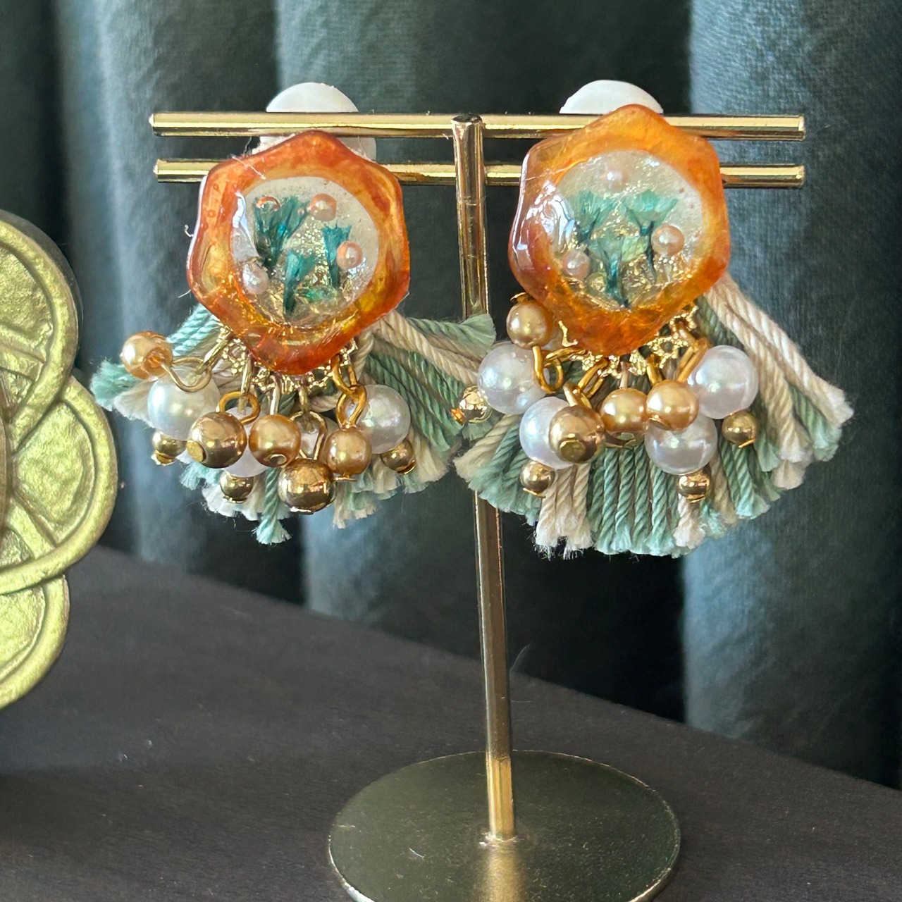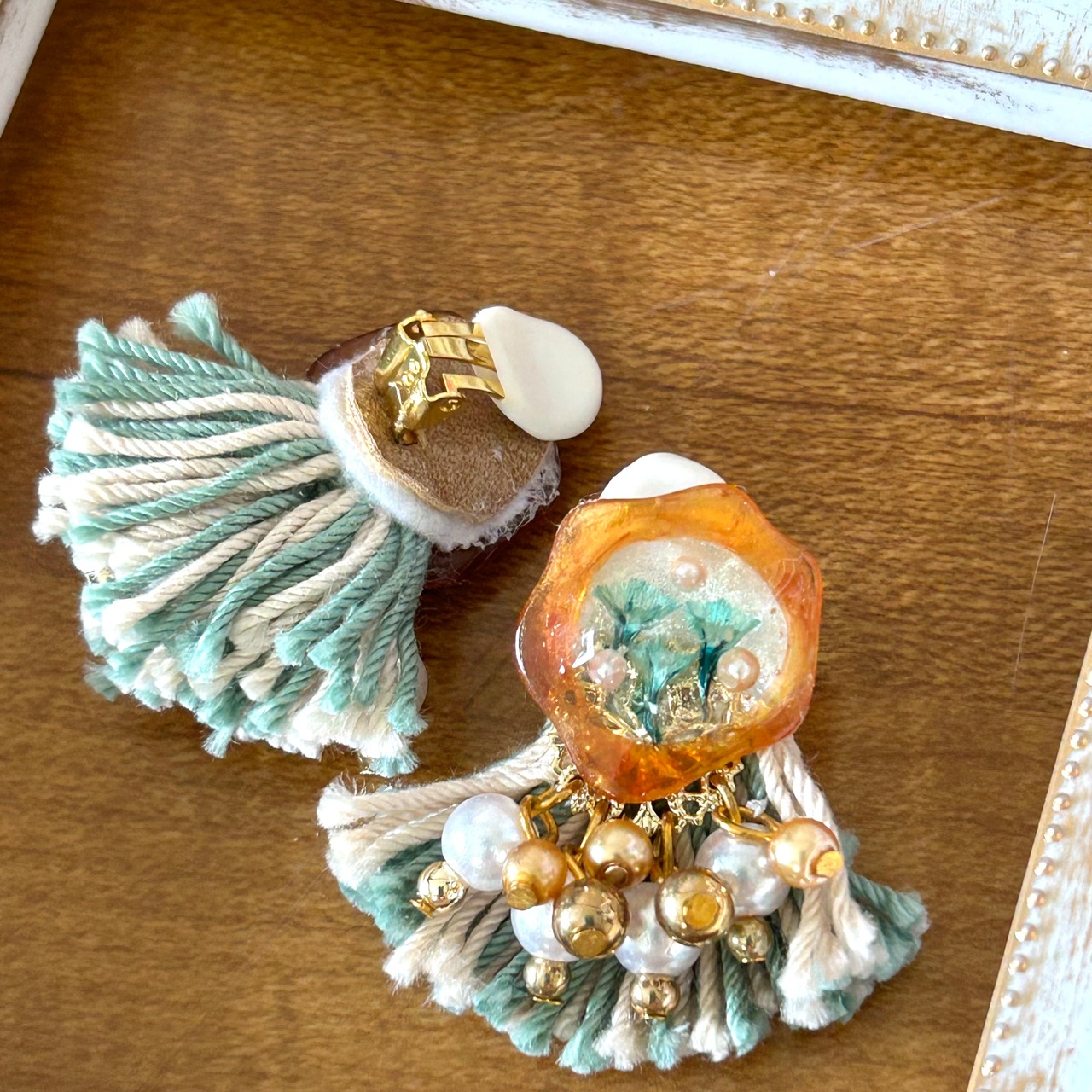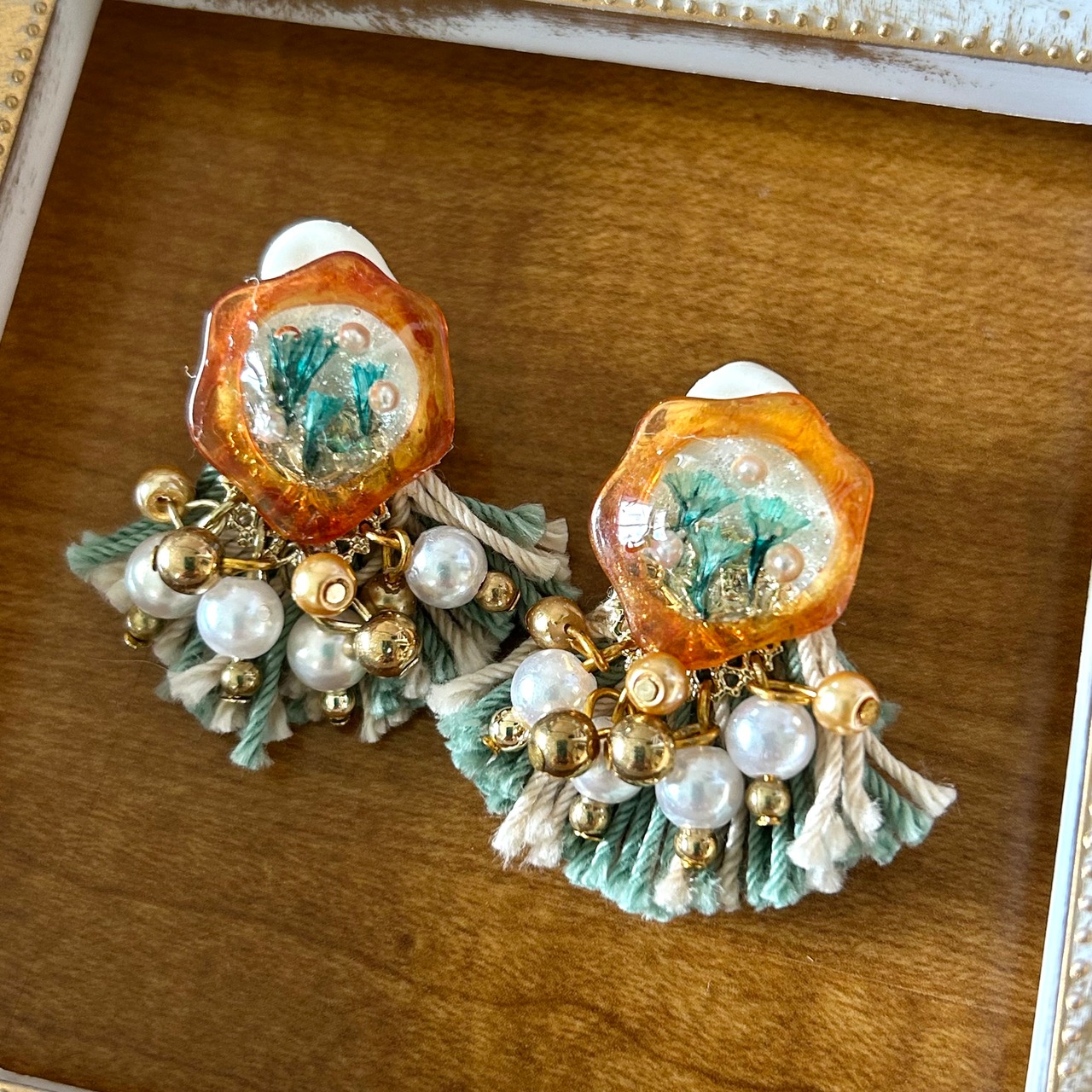 フリンジとパールなどを添えて華やかな耳飾りです。