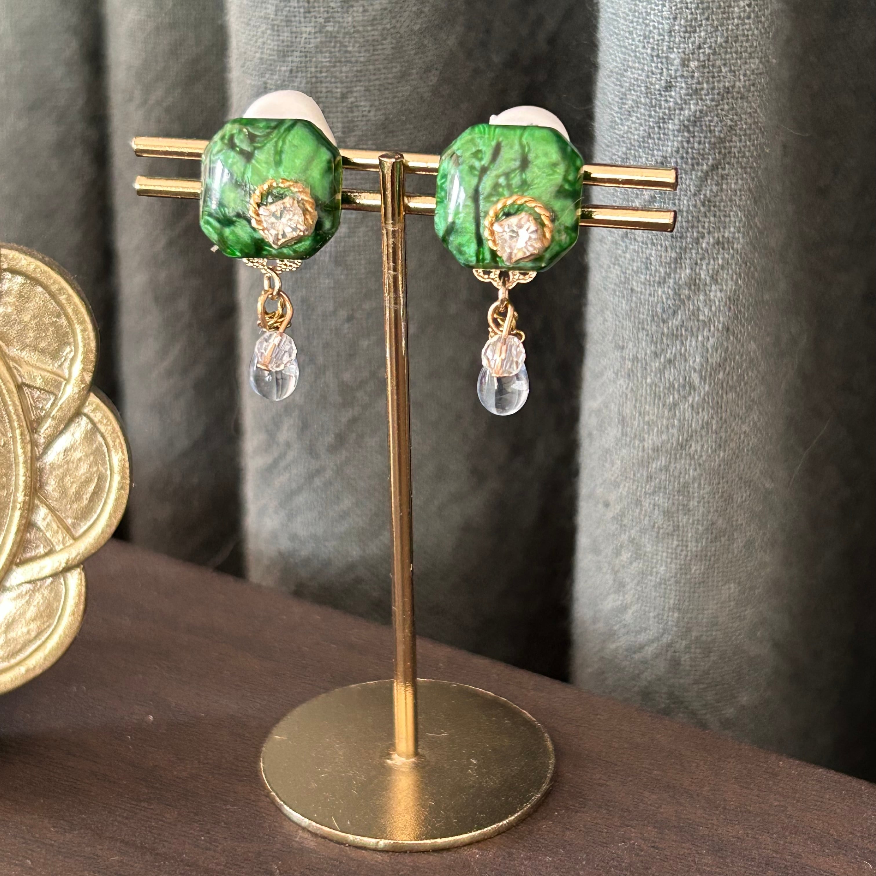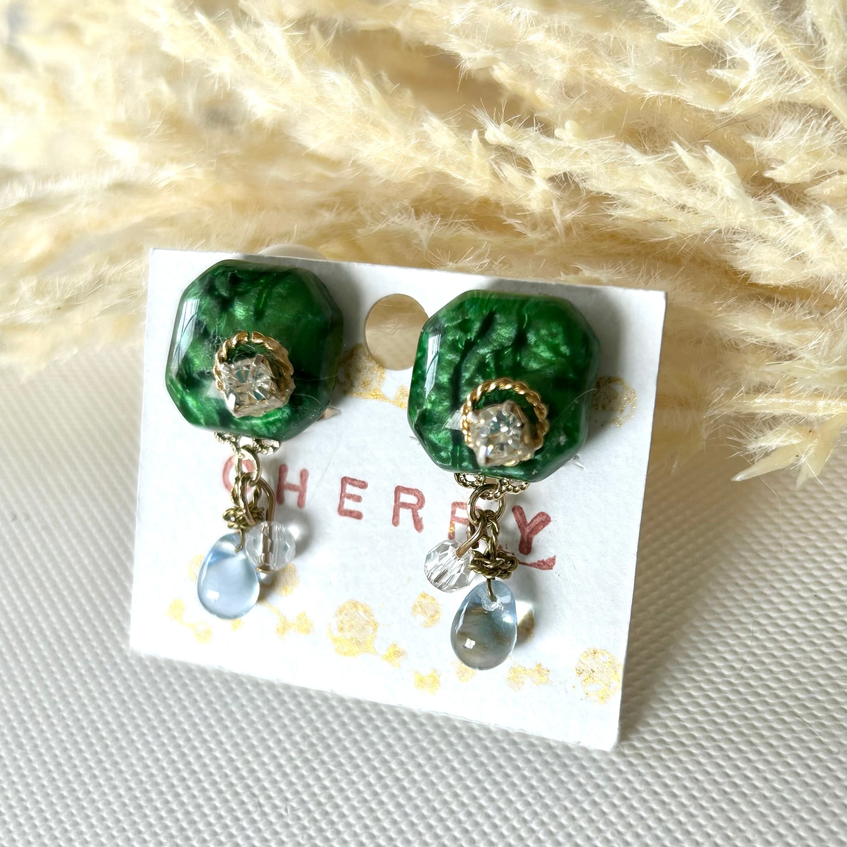 深いグリーンの四角モチーフにキラッと光るビジューが綺麗ですよ。