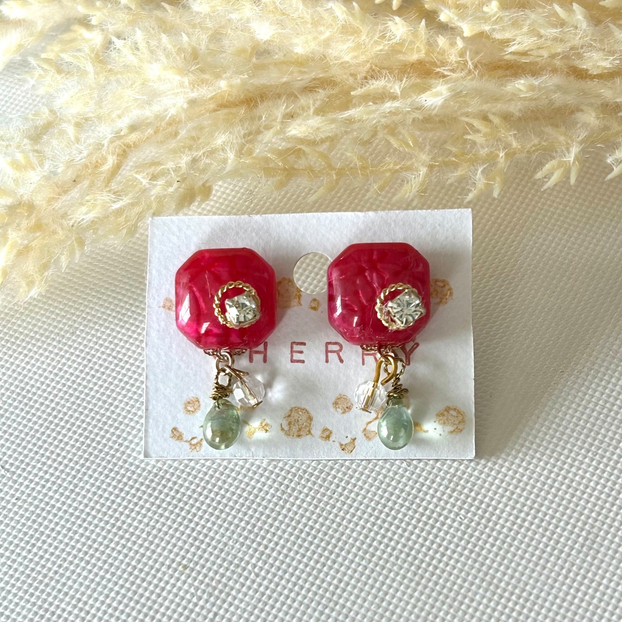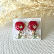 濃いピンクの四角モチーフにキラッと光るビジューが綺麗ですよ。