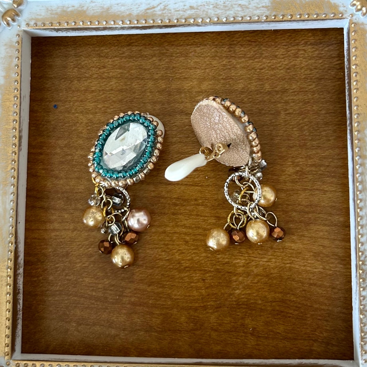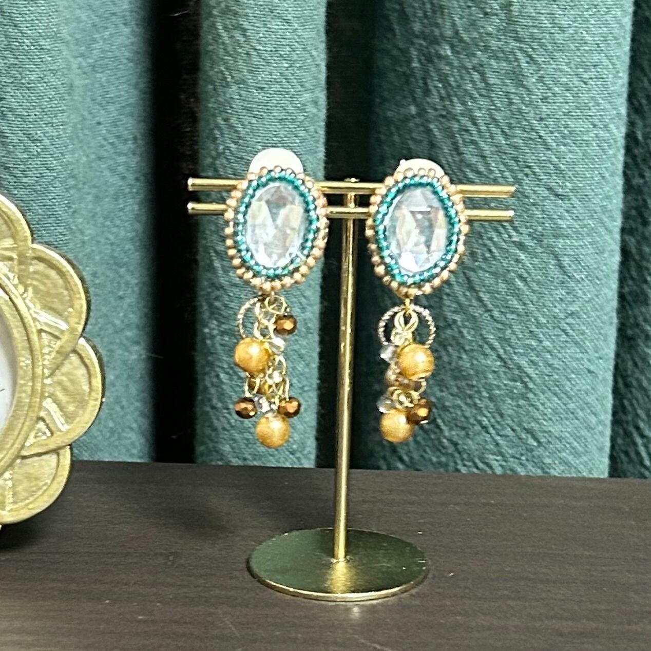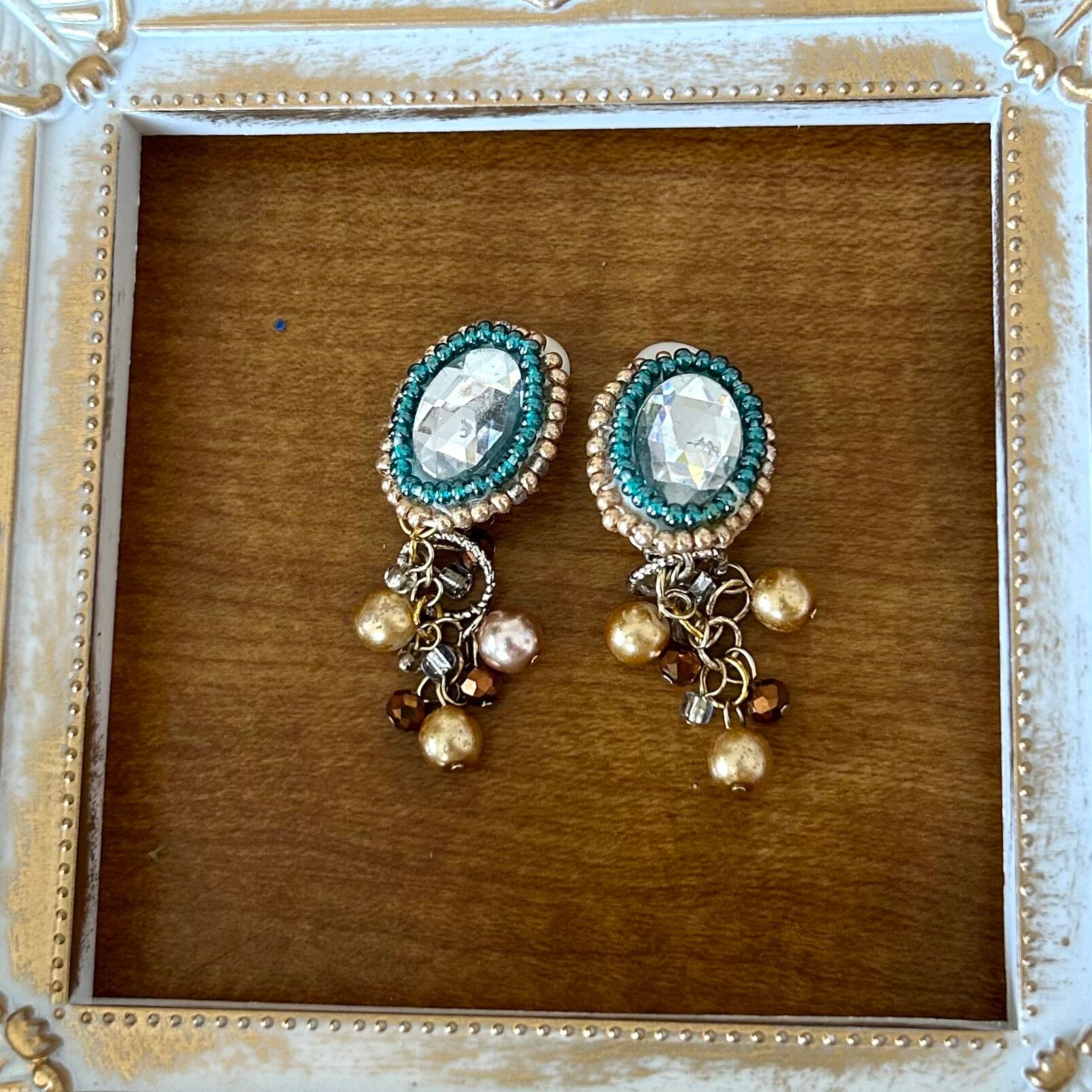 アンティーク ミラー ビーズ刺繍 ブルー イヤリング