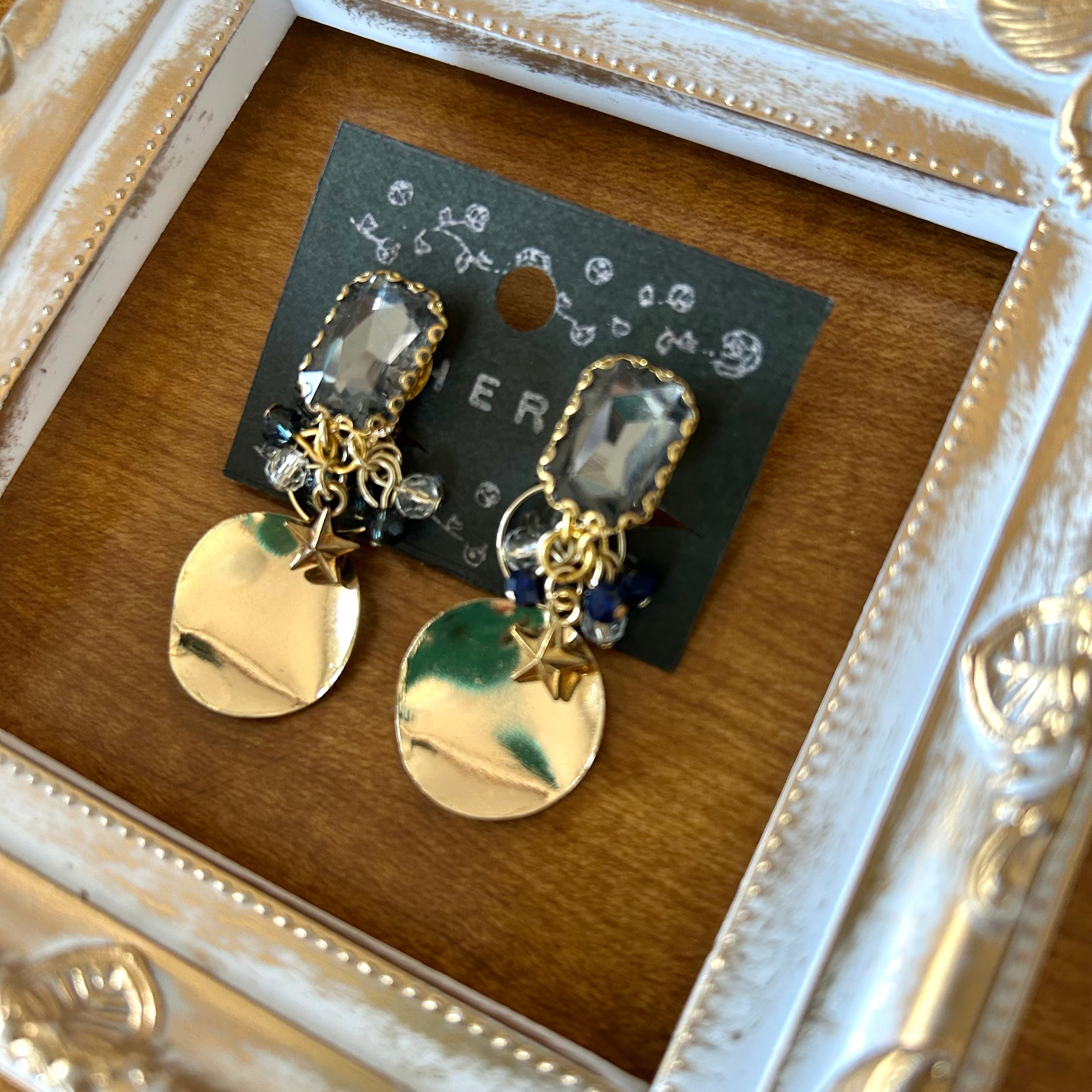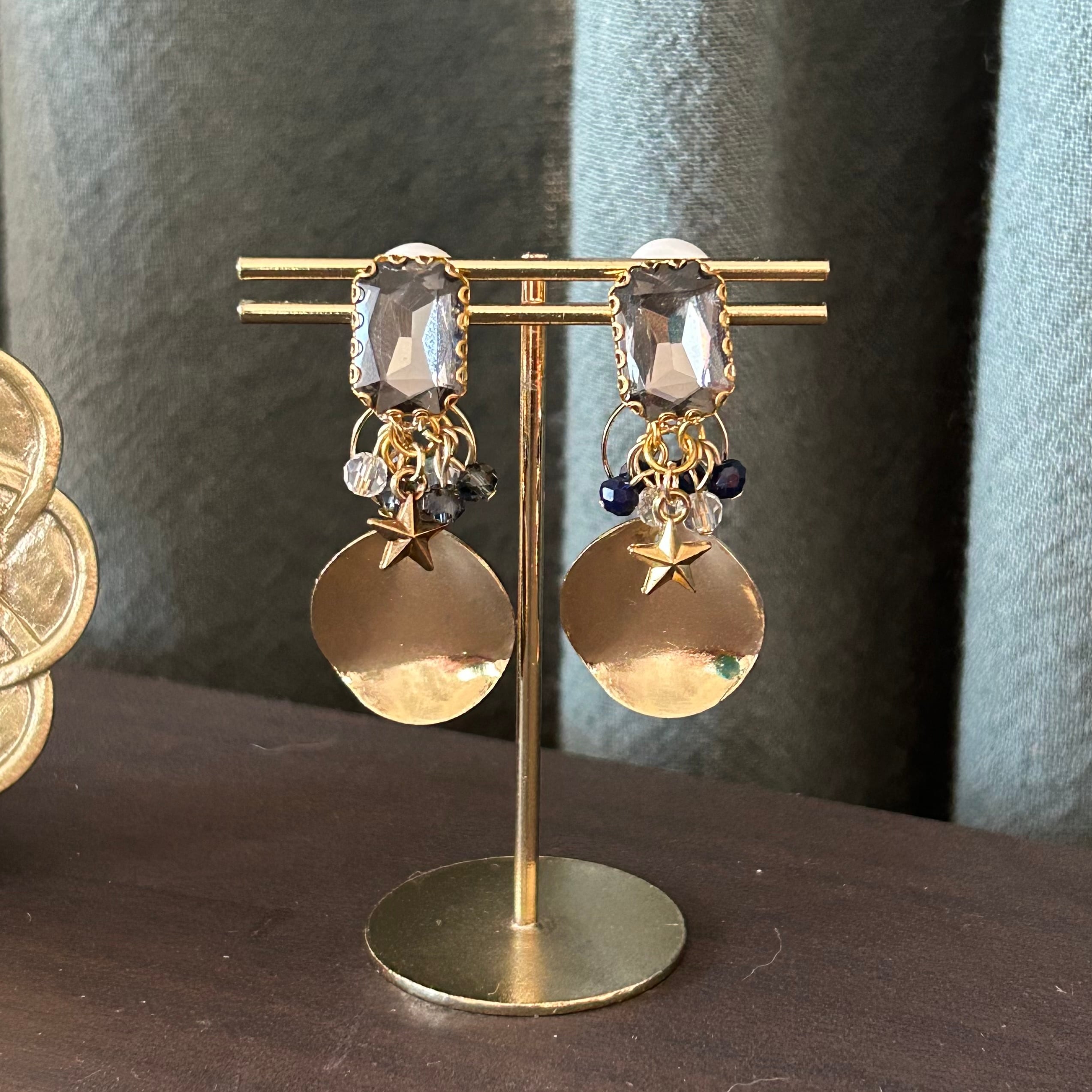四角いブラックビジューに星モチーフや様々なビーズをぶら下げたモチーフです。