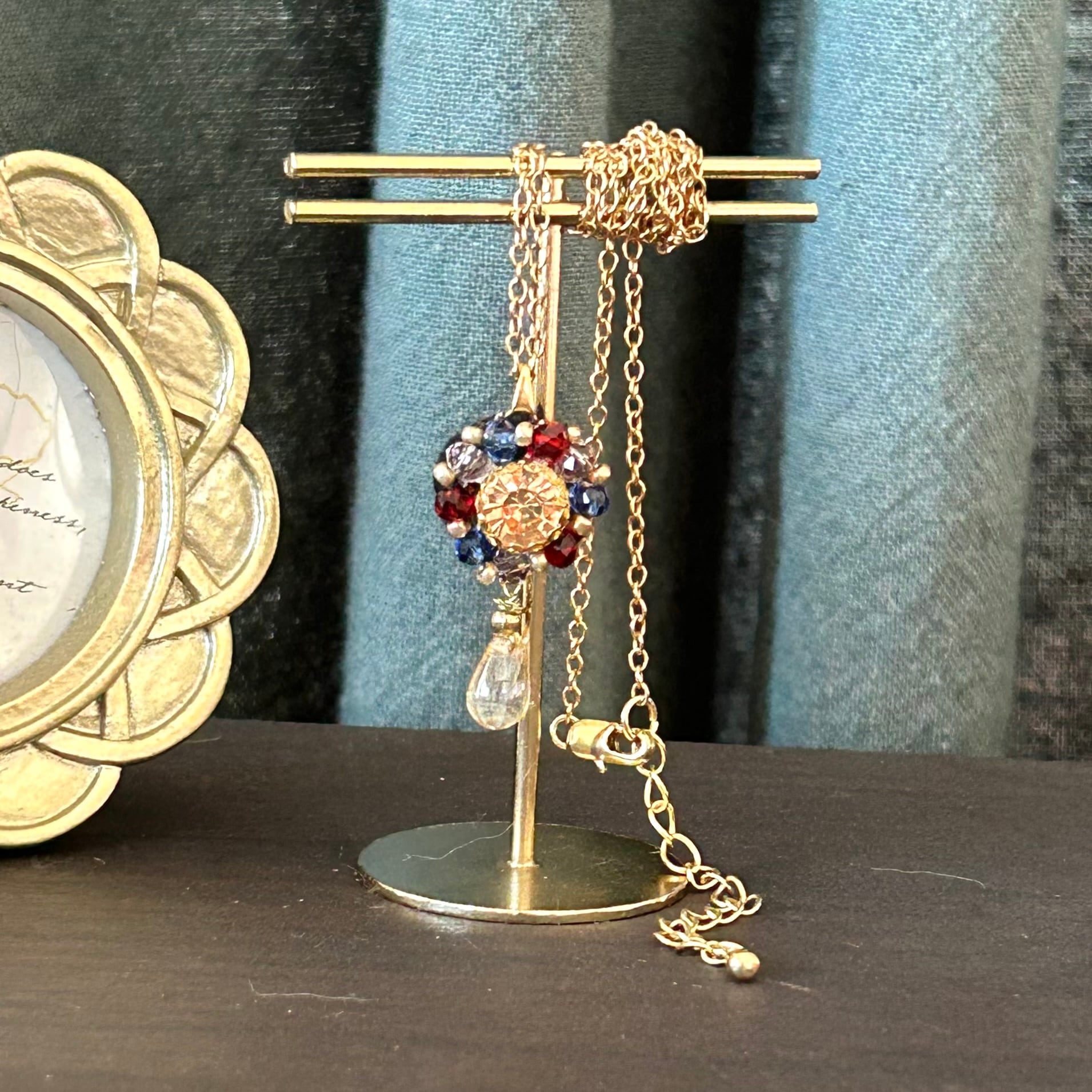 琥珀色のビジューの周りに青、赤、ゴールドのビーズを飾って大人っぽいネックレスです。