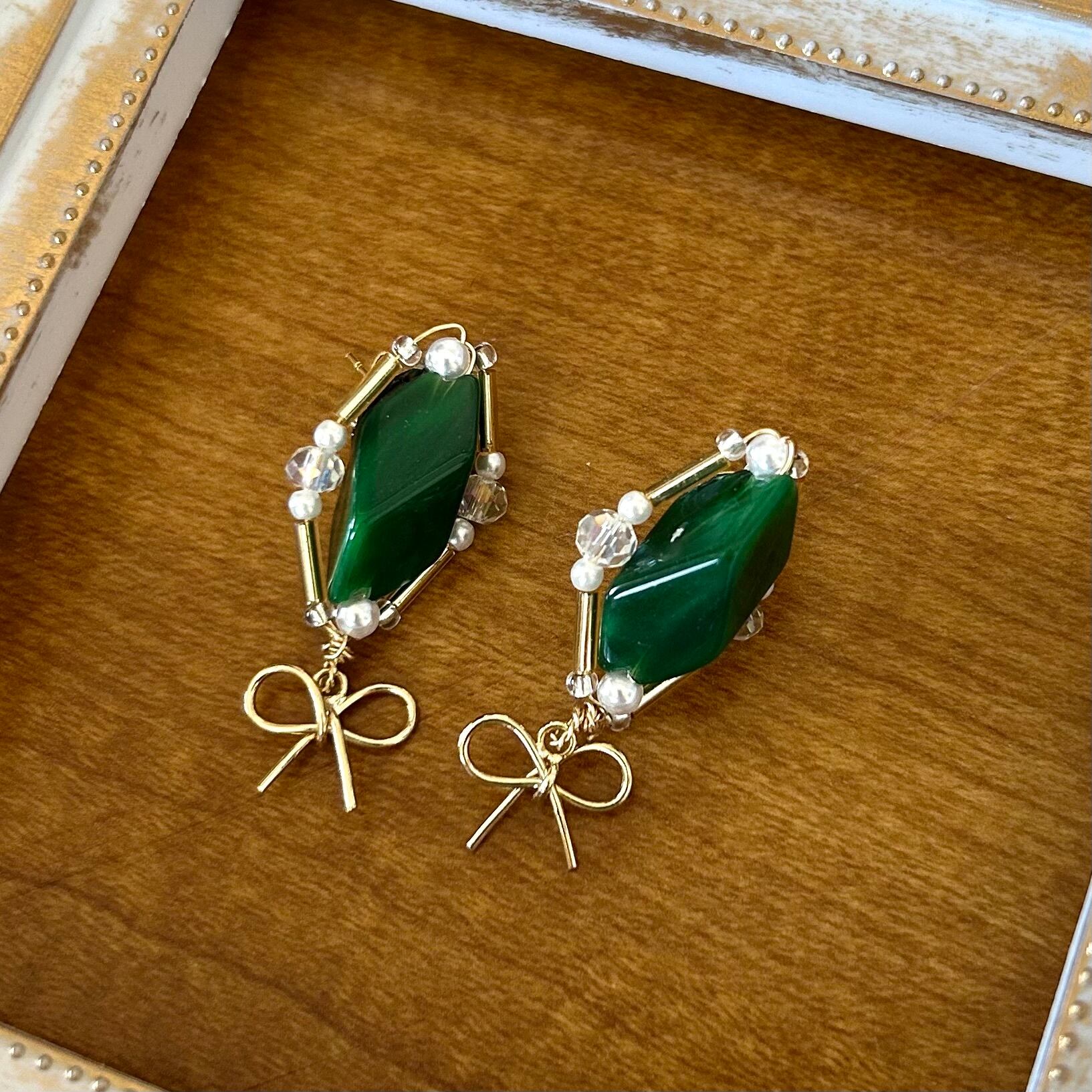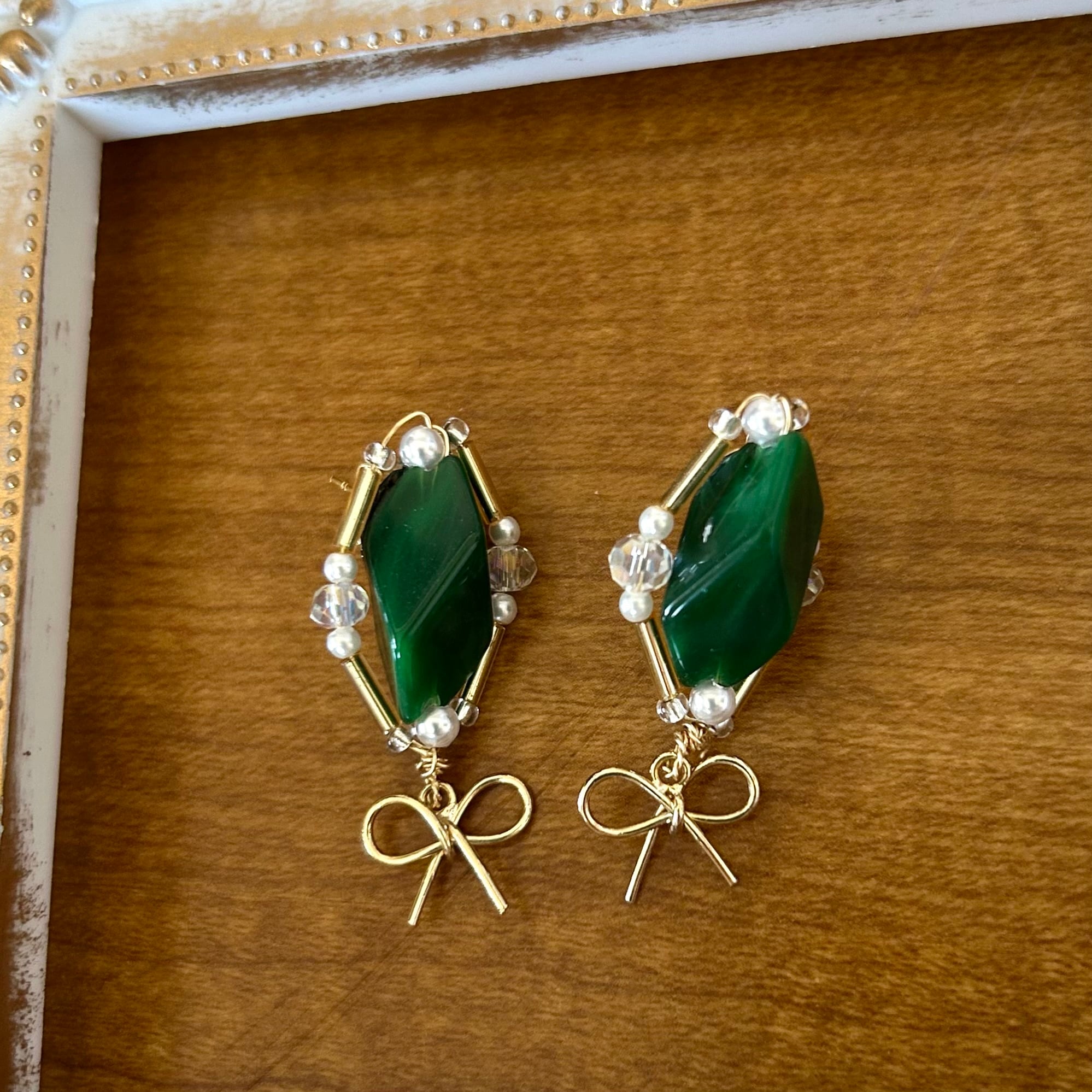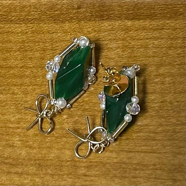 緑色の変形モチーフをビーズで囲んだ変わったデザインです。