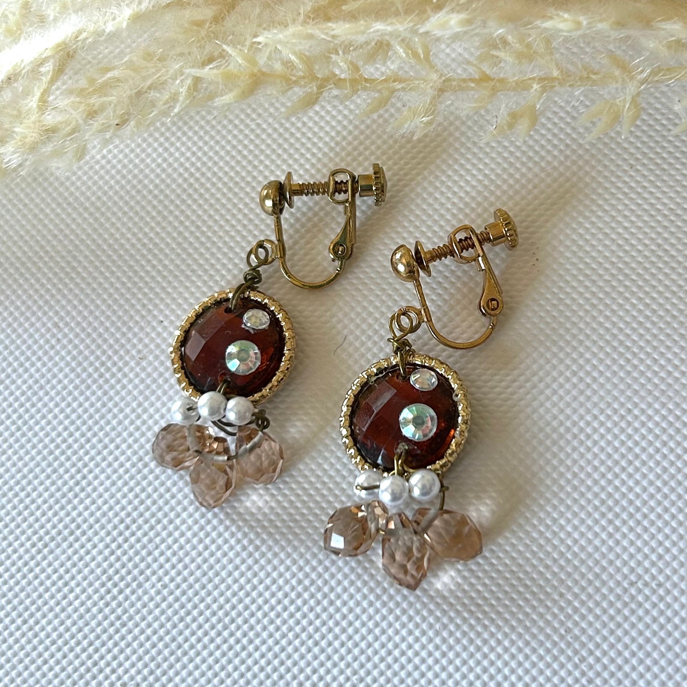 丸モチーフの下にしずくビーズかま透明感があり輝って綺麗なイヤリングです。