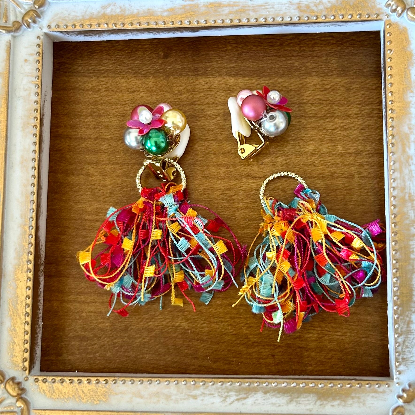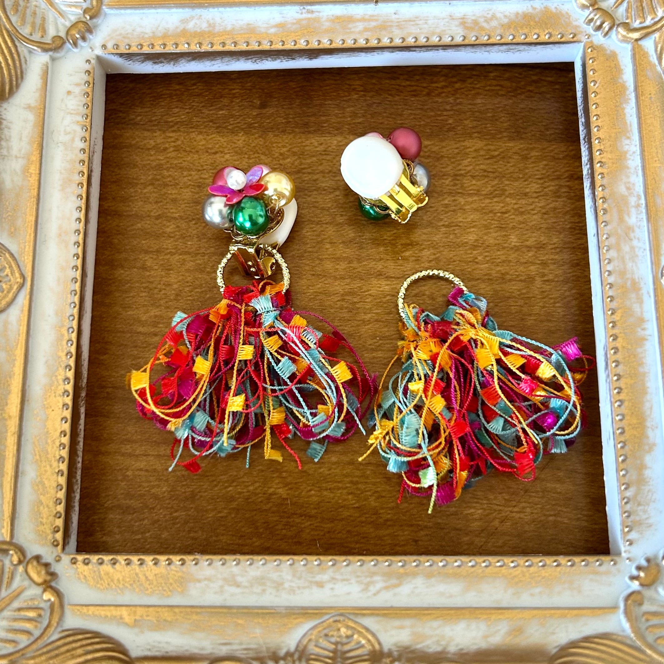 カラフルな元気カラーで可愛らしいイヤリングです。