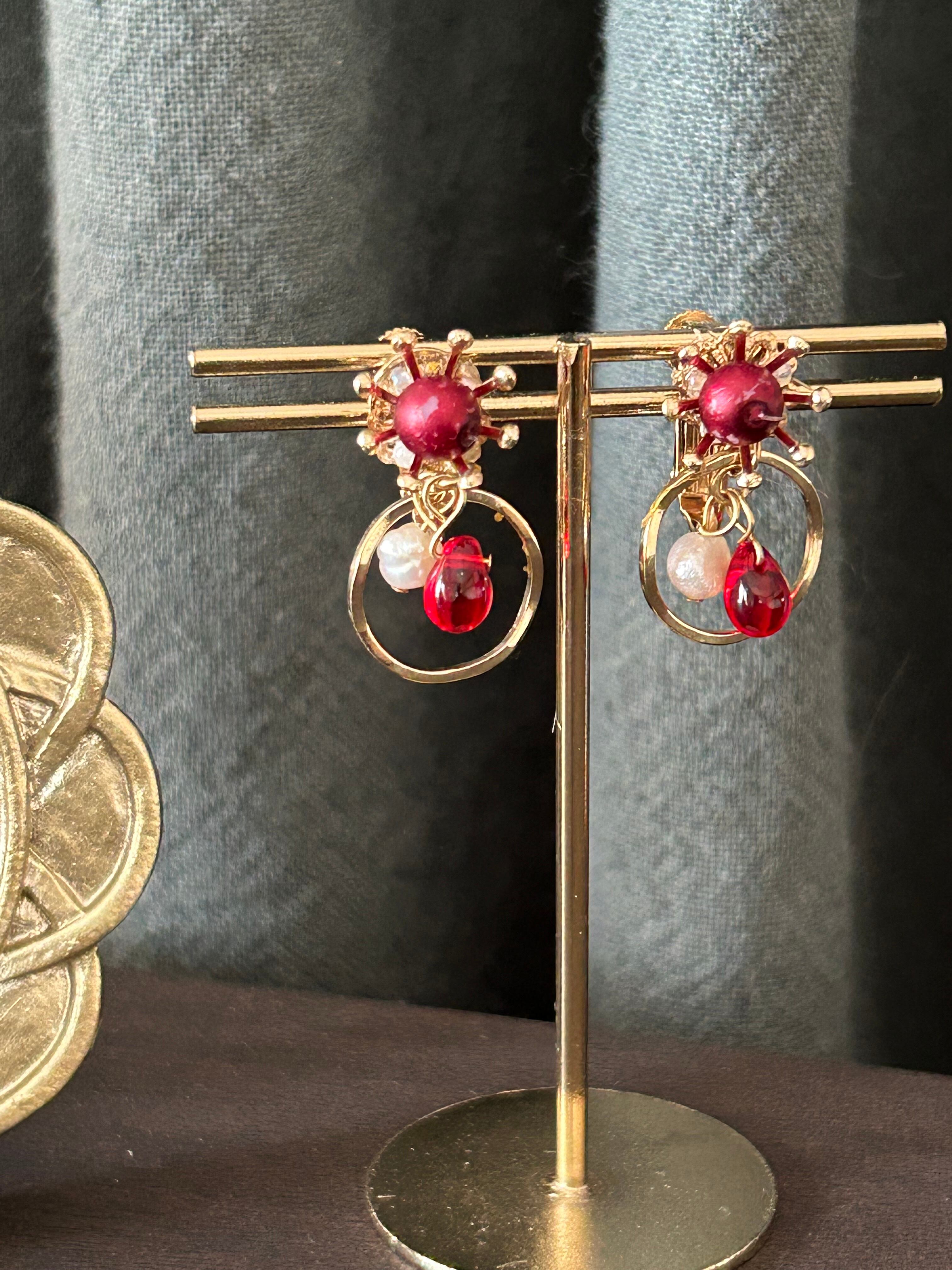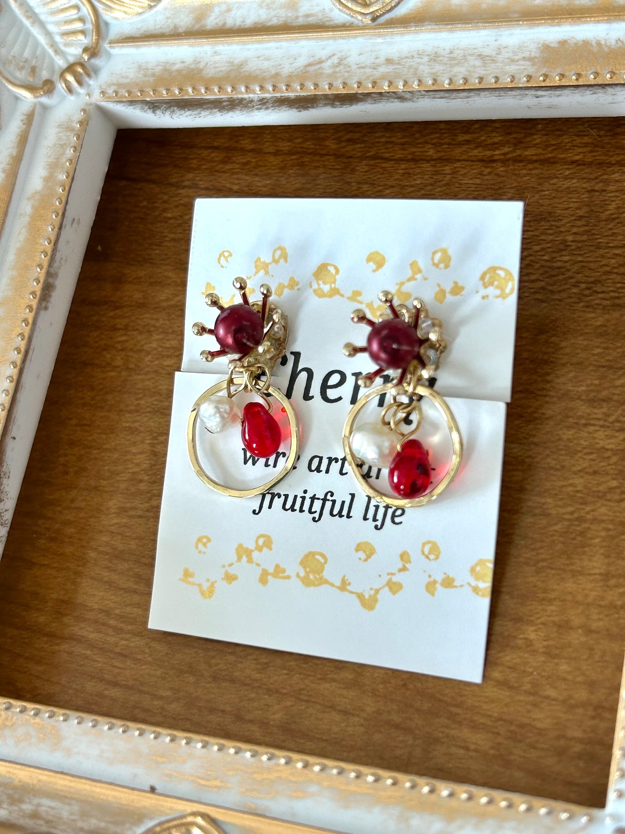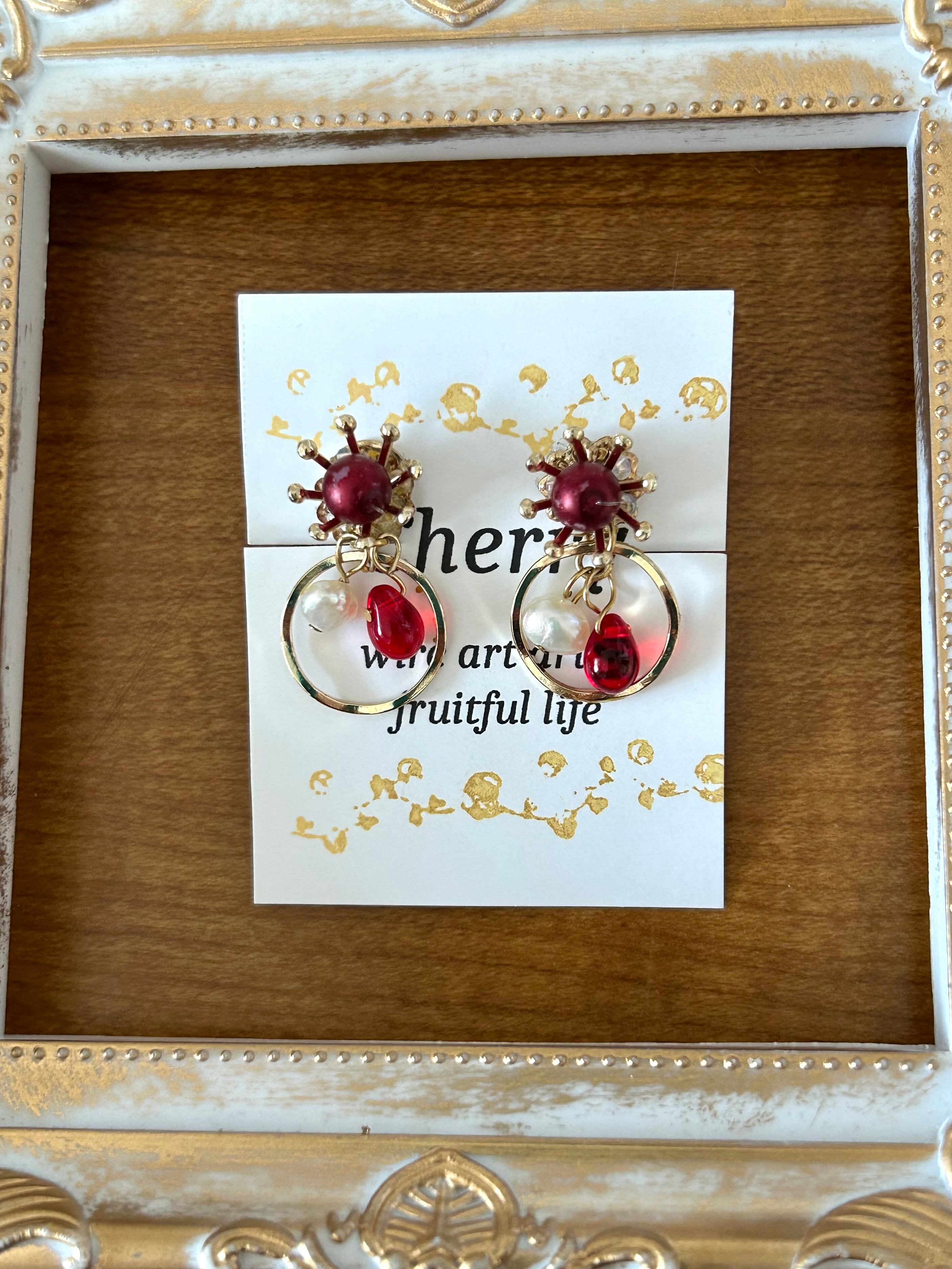 深い赤のパールを使って落ち着いた中にもキュートな雰囲気のイヤリングです。