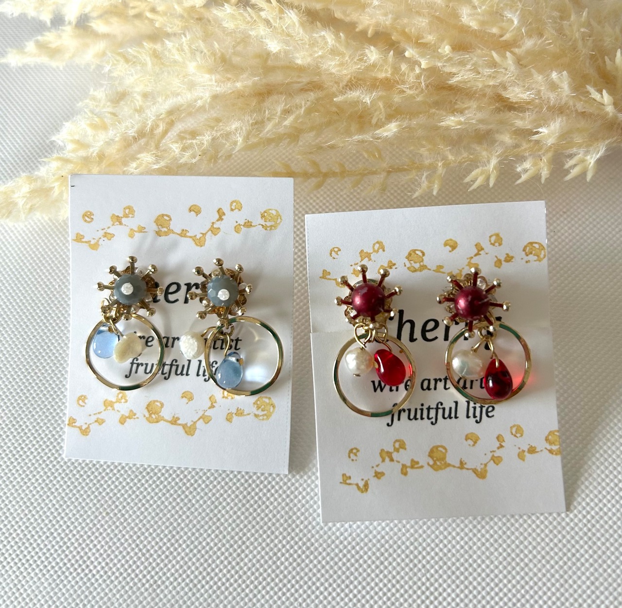 グレーのびーを使って落ち着いた大人っぽい雰囲気のピアスです。