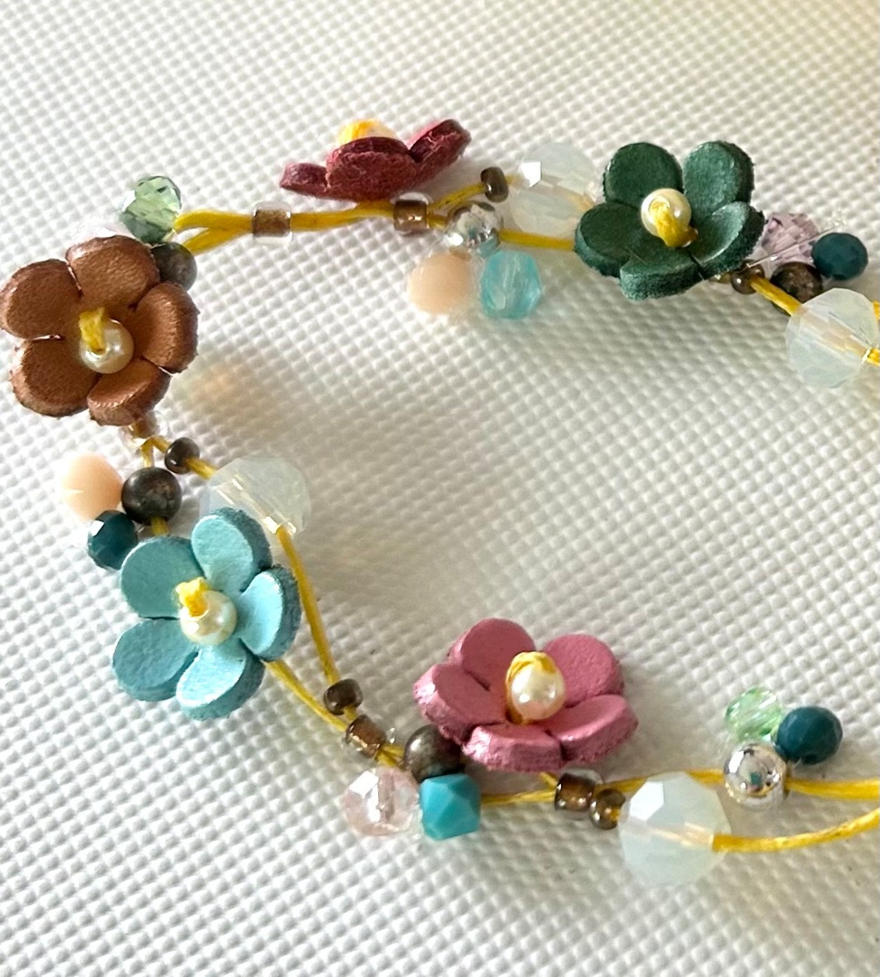 レザーのお花とビーズを黄色いロー引き紐でブレスレットにしました。