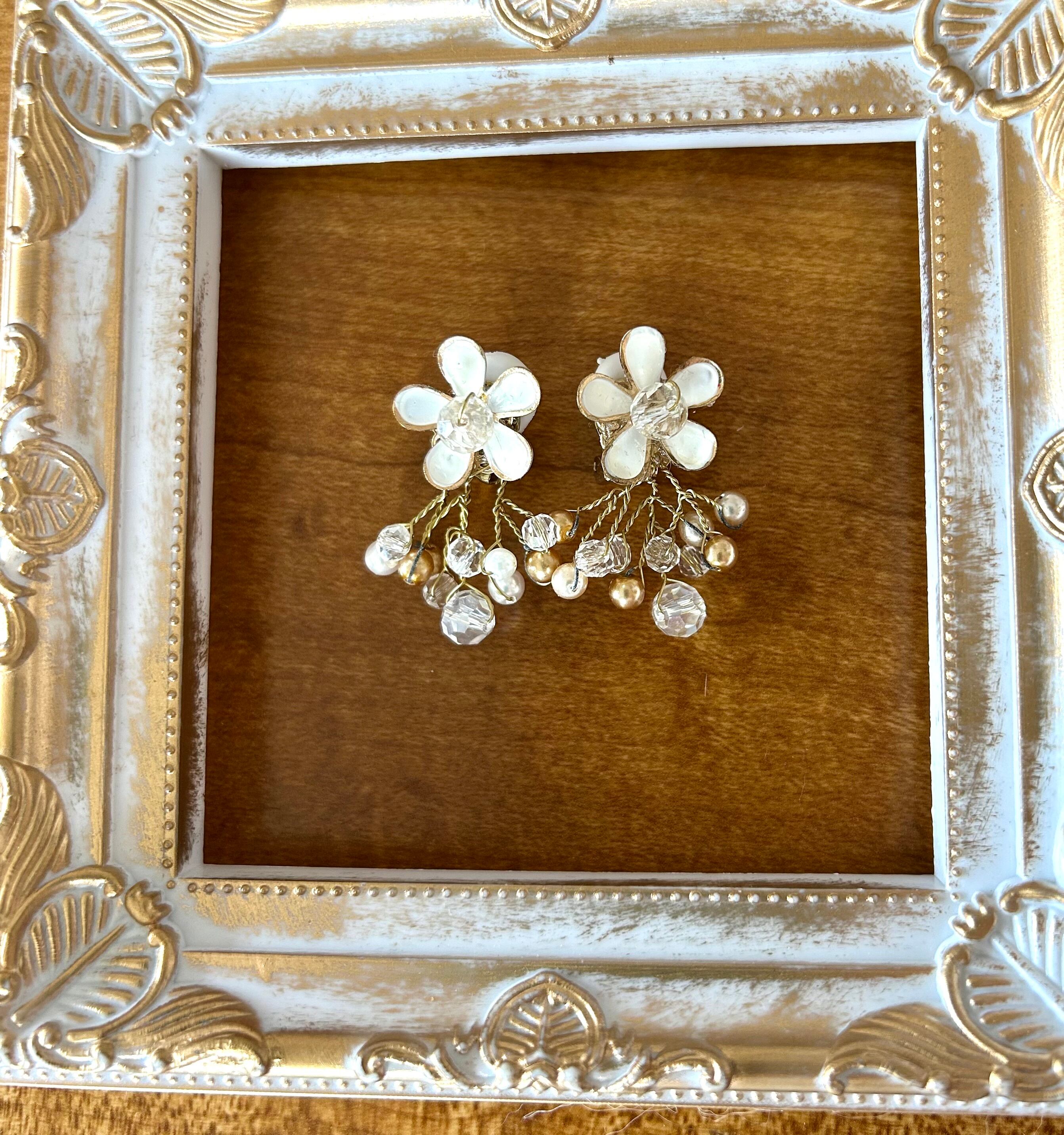 白いお花の下に小枝を飾ったピアス、イヤリングです。