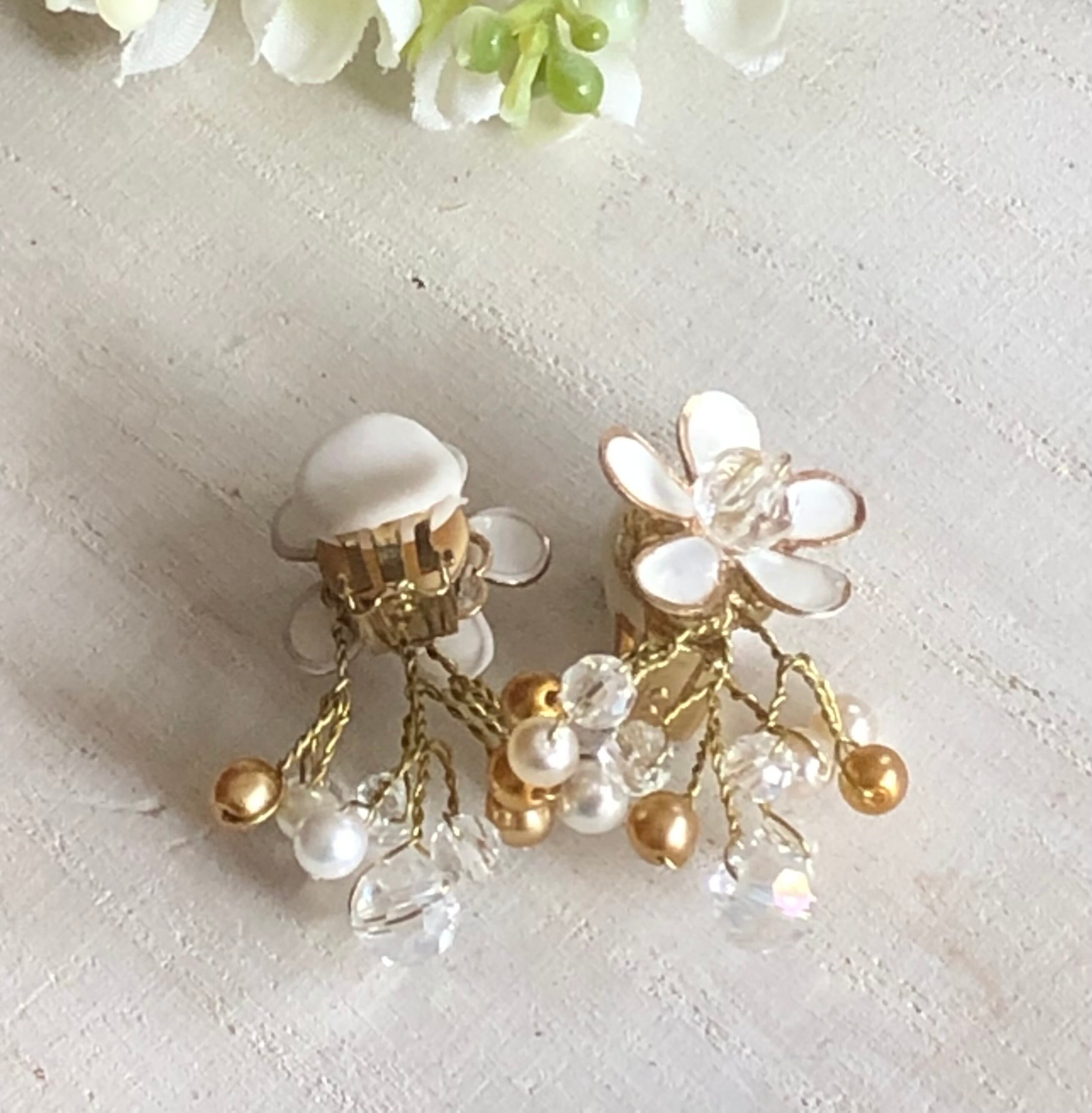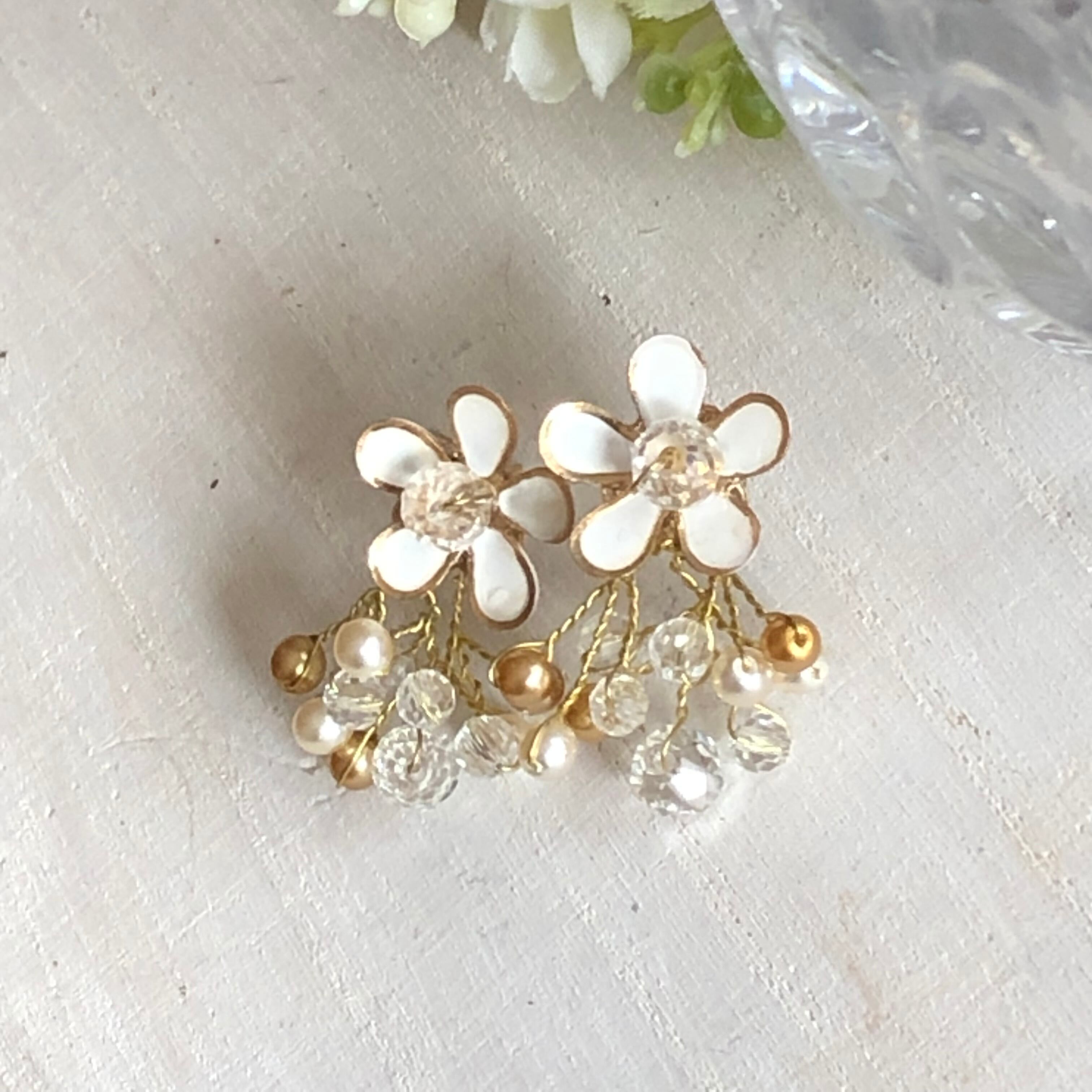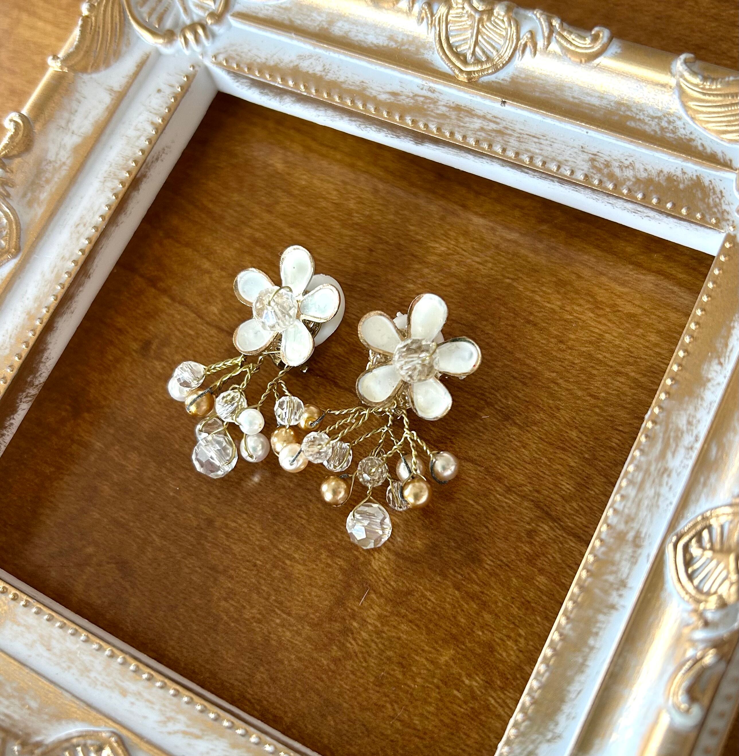 白いお花が清楚です。クリアビーズを多めに使ってキラキラと雫のよう♡