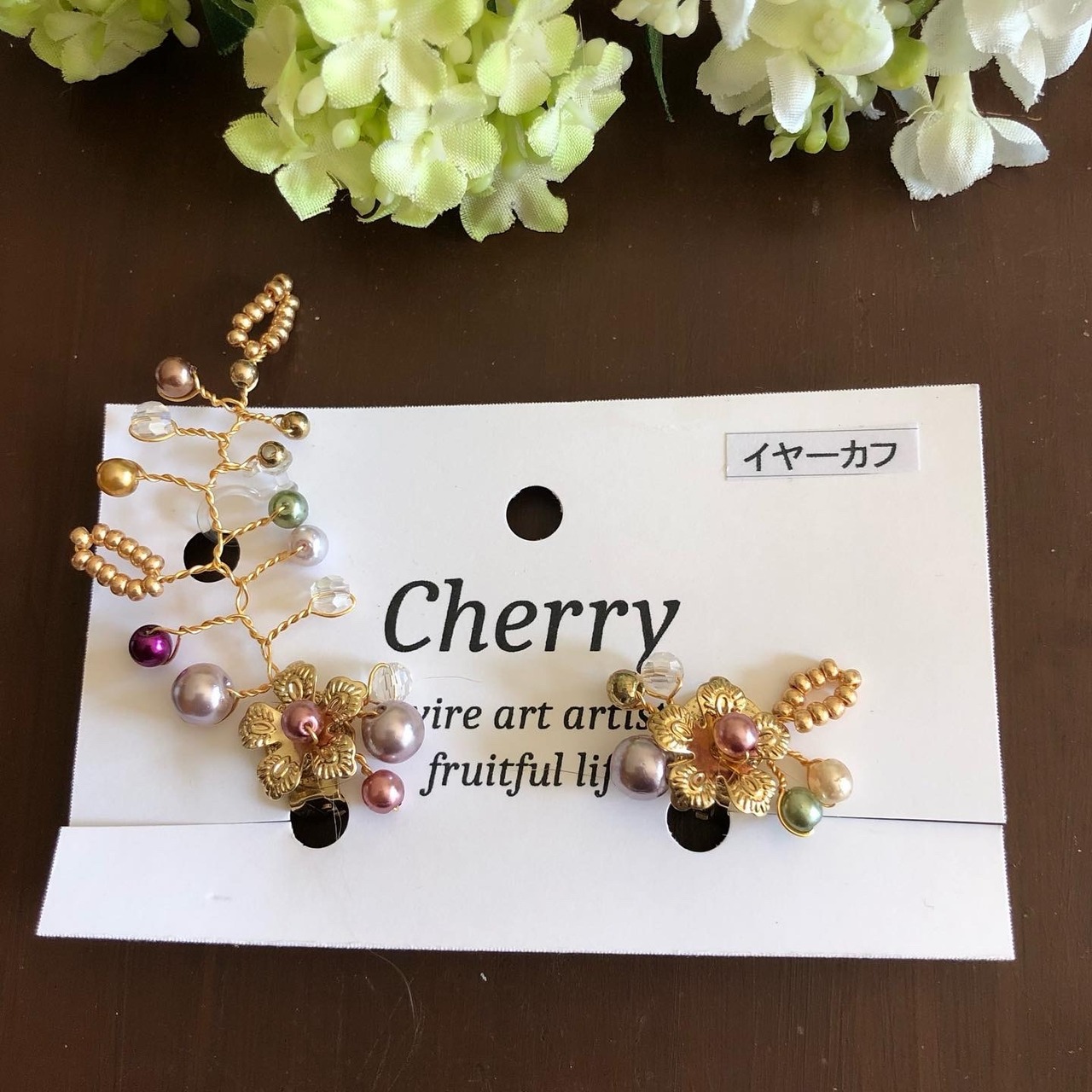 両耳タイプで、クリップイヤリング、スタッズピアスを使用しています。長い方のイヤーカフは上部はノンホールピアスで軟骨部に固定できます。